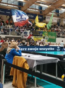 Nachdem wir unsere Plätze eingenommen hatten, wurden wir sehr freundlich vom Hallensprecher begrüßt und in der Folge wurden wir zu einem beliebten Objekt von verschiedenen Medienleuten. Überhaupt war die Stimmung sehr entspannt, gut und laut, dies war nicht nur den einzelnen Fangruppen geschuldet, sondern auch dem Hallensprecher, der immer wieder das Publikum mit verschiedenen Aktionen anstachelte und durch die Halle tobte. Eine ganz besondere Aktion war die Versteigerung von Trikots der teilnehmenden Mannschaften und von verschiedenen polnischen Superstars, gepaart mit Haushaltsgegenständen verschiedener Art, Armbanduhren etc. Wie hoch die Versteigerungserlöse im Einzelnen waren, ließ sich für uns aufgrund der mangelnden Polnisch Kenntnisse nicht ergründen.