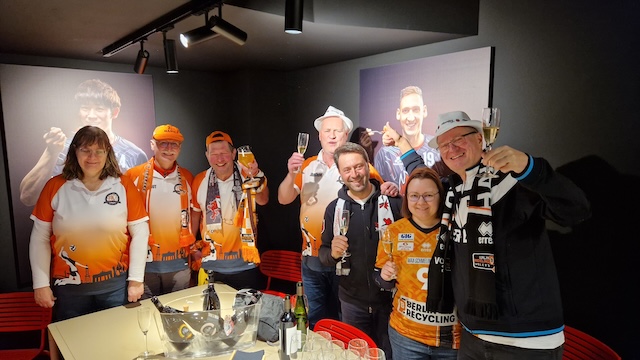 Aber es sollte noch besser kommen: Plötzlich wurde Jochen das Hallenmikro übergeben und gemeinsam, auch zur Verwunderung einiger unserer Spieler, waren unsere Anfeuerungen in der Halle deutlich zu hören. Zu Beginn des 3. Satzes kehrten dann Jochen, Madlen, Silvana, Hartmut und ich zurück auf die gegenüberliegende Seite zu unseren Plätzen, getragen von einem intensiven Fanerlebnis, das für uns auch die bittere Niederlage unseres Teams einigermaßen kompensierte. Herzliche Verabschiedung nochmals in der Halle und große Freude darüber, einen kleinen Teil der Fangruppe im Februar in Berlin begrüßen zu dürfen.