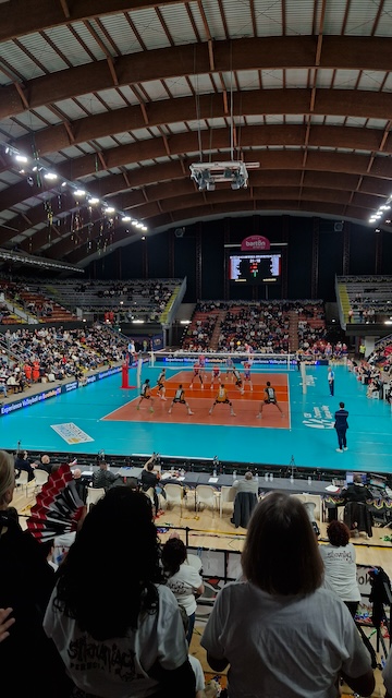 Er stellte uns dann auch den Vertreter des Hauptsponsors Sir Sicoma vor, der ebenso mit einem Fanschal ausgestattet, das Spiel von der VIP-Tribüne aus verfolgte. Da die tolle Gastfreundschaft im VIP-Bereich verhinderte, dass wir noch die geplante Übergabe von Fanutensilien mit den Sirmaniaci vor dem Spiel vollziehen konnten, verschoben wir dies einfach in die Satzpause nach dem ersten Satz. Super freundlich empfangen wurden wir unsere Sachen in Windeseile los, schauten in freundliche und zugewandte Gesichter, und Michele, der bereits mit dem orangen 7. Mann-Käppi im Fanblock stand, lud uns ein, den 2. Satz bei ihnen im Fanblock zu verbringen, was wir dankend annahmen. So wurden wir Teil der supertollen Stimmung in der Pala Barton und konnten dann auch das immer wieder harmonische Miteinander mit der anderen Fangruppe, der Curva Norte, genießen. Im Fanblock der Sirmaniaci