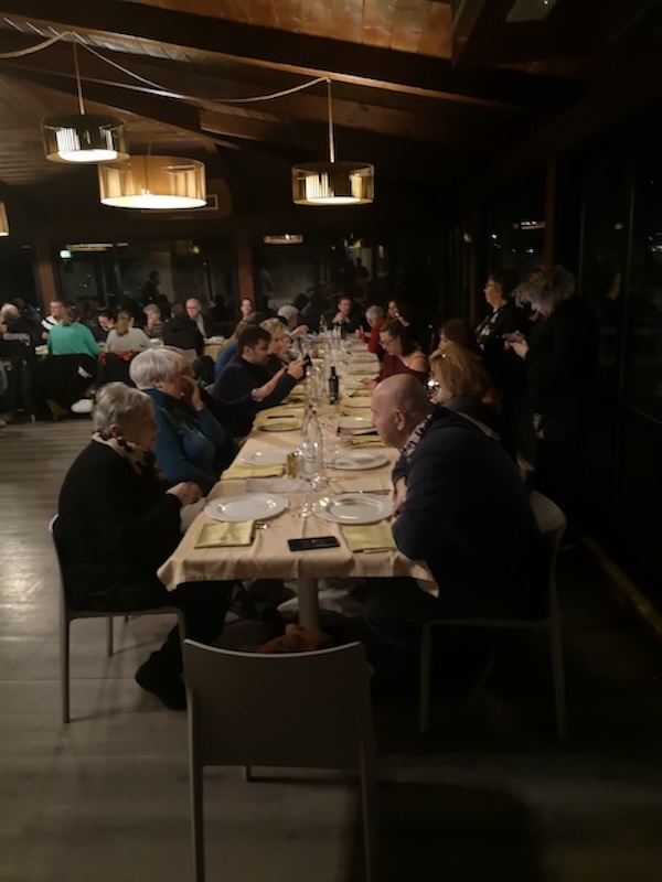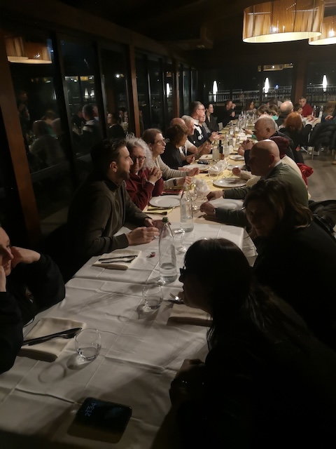 Okay, Treffpunkt im ‚Dolce Vita‘,  so ab 20:30 Uhr am Dienstagabend, wir dachten an ein kleines Meeting am Vorabend, ein bisschen kennenlernen, das eine oder andere Kaltgetränk gemeinsam trinken und gutes italienisches Essen genießen, und es kam anders. Da die römische Rushhour uns ein wenig Zeit abgenommen hatte, waren wir erst gegen 21:00 Uhr am Restaurant, Michele war darüber informiert und hatte uns einen genialen Empfang bereitet. Ungefähr 40 Sirmaniaci empfingen uns in einem großen Nebenraum, alle warteten gespannt auf unser Erscheinen und dann ging zum ersten Mal die Post ab, megafreundliche Begrüßung, Hände schütteln da, Schulterklopfen dort, Wasser, Wein, Bier, Softgetränke und dazwischen Fangesänge und unendlich Essen. „Wir haben eine Kleinigkeit vorbereitet“, sagte Michele, und dann wurden umbrische Vorspeiseköstlichkeiten aufgetischt, es gab nach Wahl Pasta oder Pizza ohne Ende und zu guter Letzt gebackene Hefefladen mit perugianer Schokoladencreme – Perugia ist die Schokoladenhauptstadt in Italien und alles für einen schmalen Taler. Zwischendurch immer wieder Fangesänge von beiden Seiten, wir wurden mit Hüten und anderen Sachen ausgestattet und waren entsprechend geflasht.