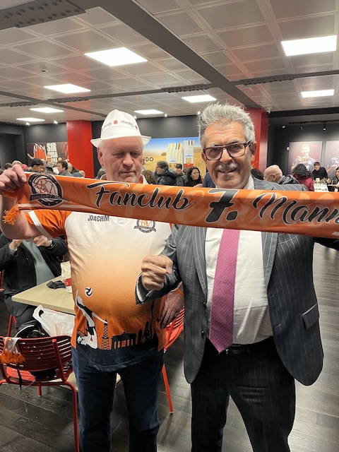 Im Gewusel des VIP-Raumes lernten wir dann den Vereinspräsidenten Gino Sirci kennen, der dann ausgestattet mit einem Fanschal des 7. Mannes am Spielfeldrand das Spiel verfolgte.