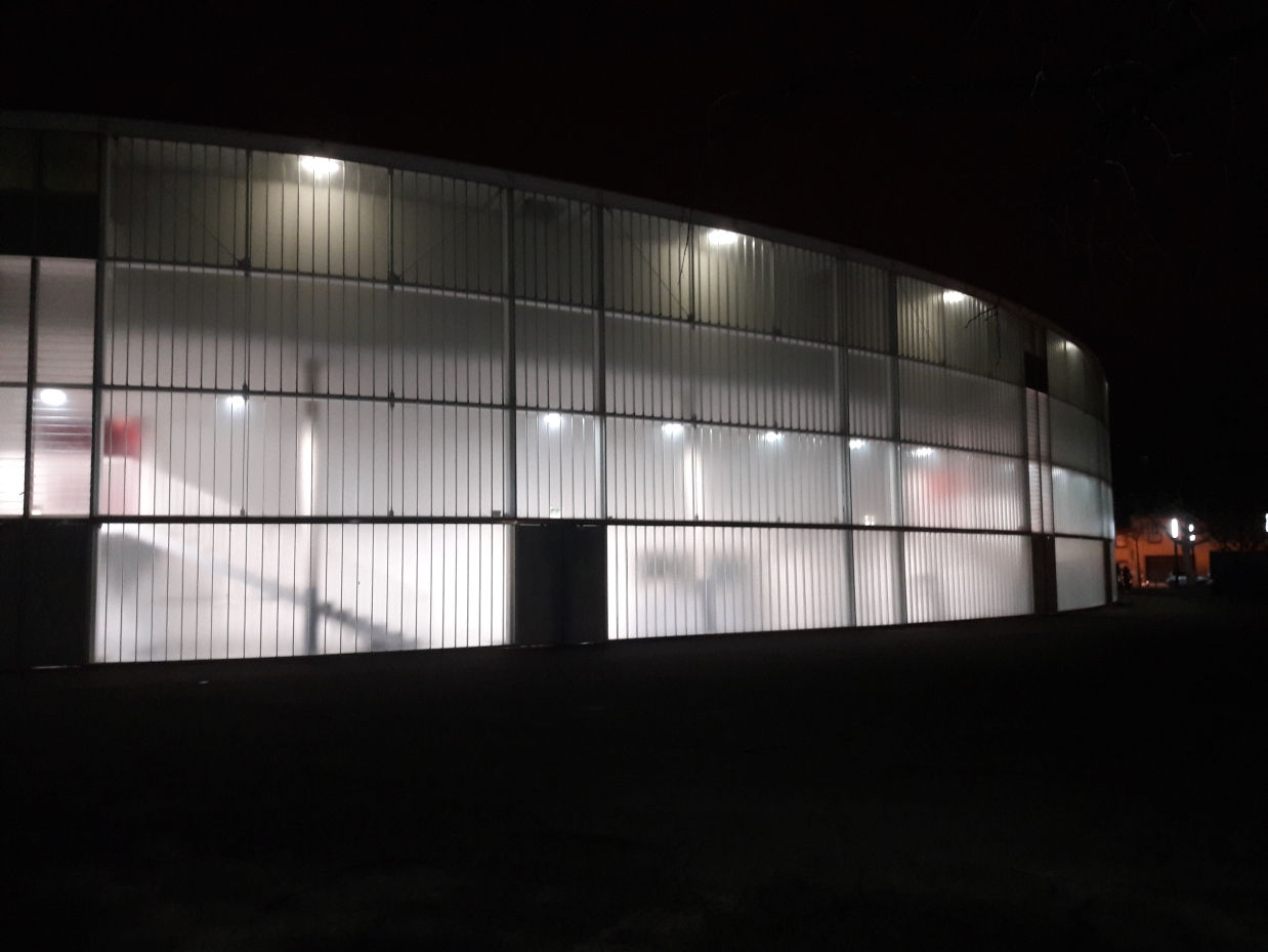 An der Halle angekommen staunten wir aber etwas, denn nichts wies darauf hin, wo wir uns befinden. Keine Beschriftung, lediglich ein erleuchtetes rundes Etwas stand vor uns. Die Ankunft des Mannschaftsbusses brachte uns aber die sichere Erkenntnis, dass wir richtig sind.