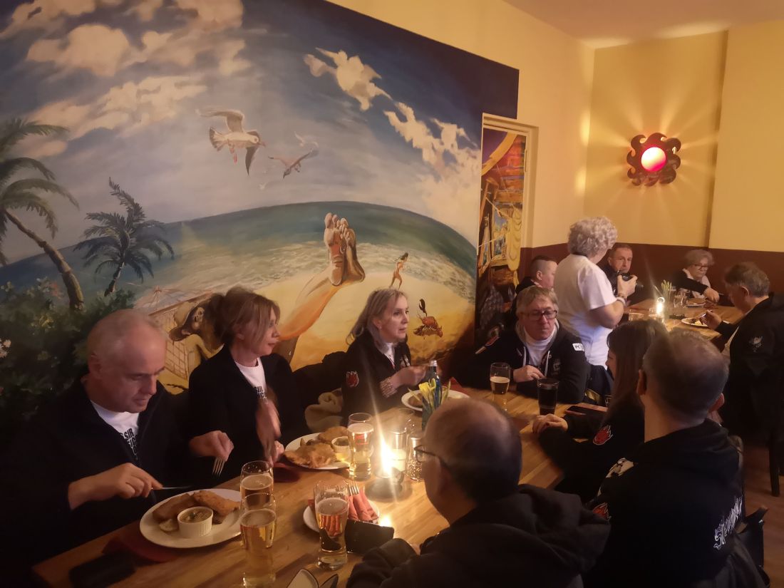 Nun drei Jahre später, nahmen wir im Vorfeld des Spiels Kontakt mit der Fangruppe auf. Der Zugang war schnell hergestellt, da der Teammanager Goran Vujevic von Sir Sicoma unsere Anfrage schnellstmöglich an die Fangruppe weitergeleitet hat und wir auch prompt eine Antwort bekamen. Nach anfänglichen Verständigungsproblemen, fanden wir einen guten Weg, effektiv zu kommunizieren. Was wollen wir tun, nur ein einfaches meet and greet, nein, der intensive Kontakt im Vorfeld schaffte einen Rahmen, der etwas besonderes nach sich ziehen musste. Unsere Kontaktpartnerin, die leider zum unserem Auswärtsspiel in Perugia nicht anwesend sein konnte, vermittelte uns an einen Fankollegen, der uns mit ca. 40 weiteren Sirmaniaci einen tollen Empfang im ‚Dolce Vita‘ bei Köstlichkeiten aus Umbrien, Pizza und Pasta bereitete. Zudem wurden wir mit Fanutensilien der Sirmaniaci ausgestattet, das alles bei bester, lautstarker Stimmung.