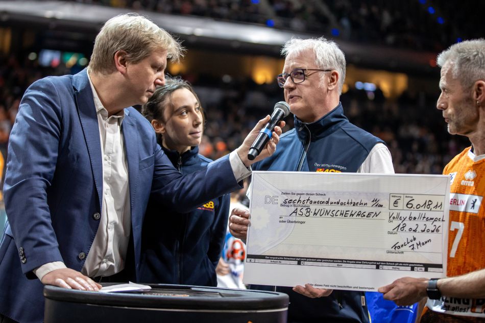 Am vergangenen Mittwoch, in einer Satzpause des Spiels gegen Perugia, erfolgte die Übergabe des Schecks. Unser Carsten durfte den stolzen Betrag von 6.018,11 Euro dem Projekt Wünschewagen übergeben.
