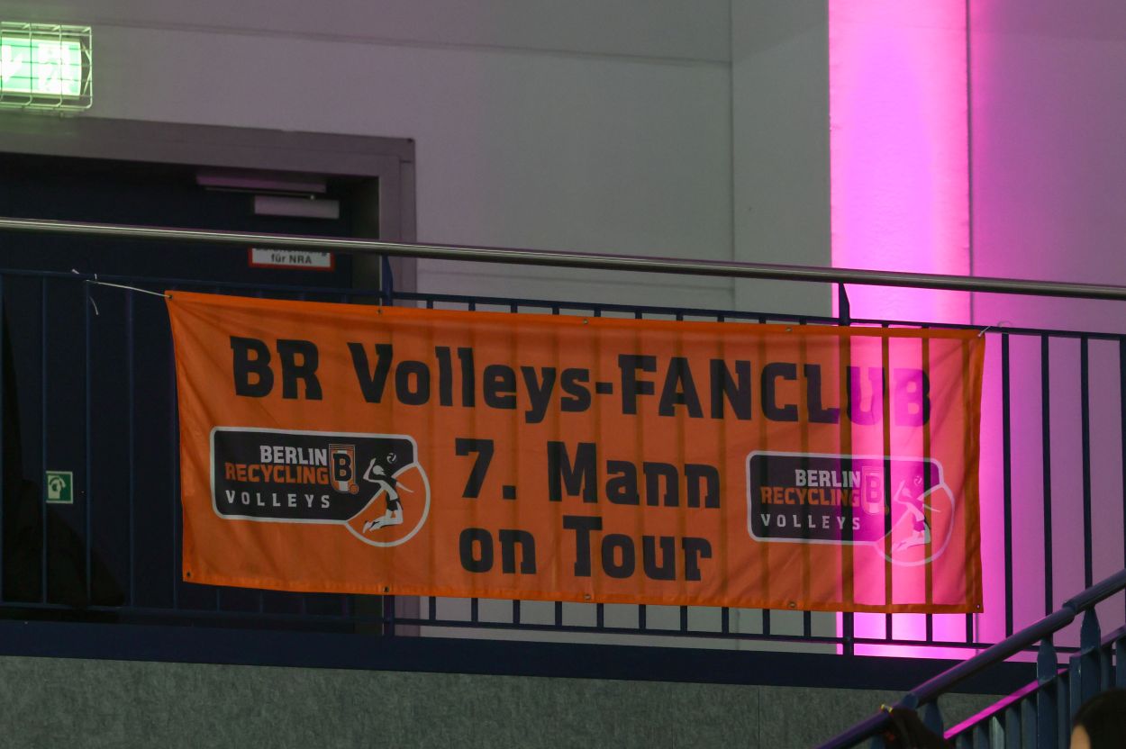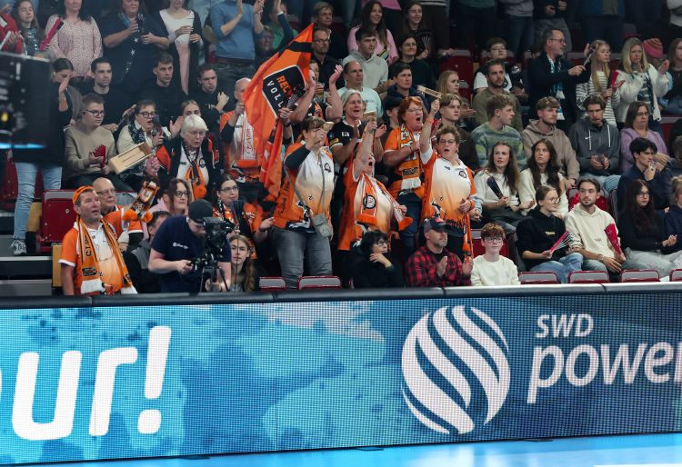 Gemeinsam mit den Moskitos pilgerten wir dann zur Arena Kreis Düren. Dort schlossen sich uns zwei junge BR Volleys Fans aus Essen an, Orange Farbtupfer, verteilt in der Halle, lockerten das Bild in der ausverkauften Arena auf.